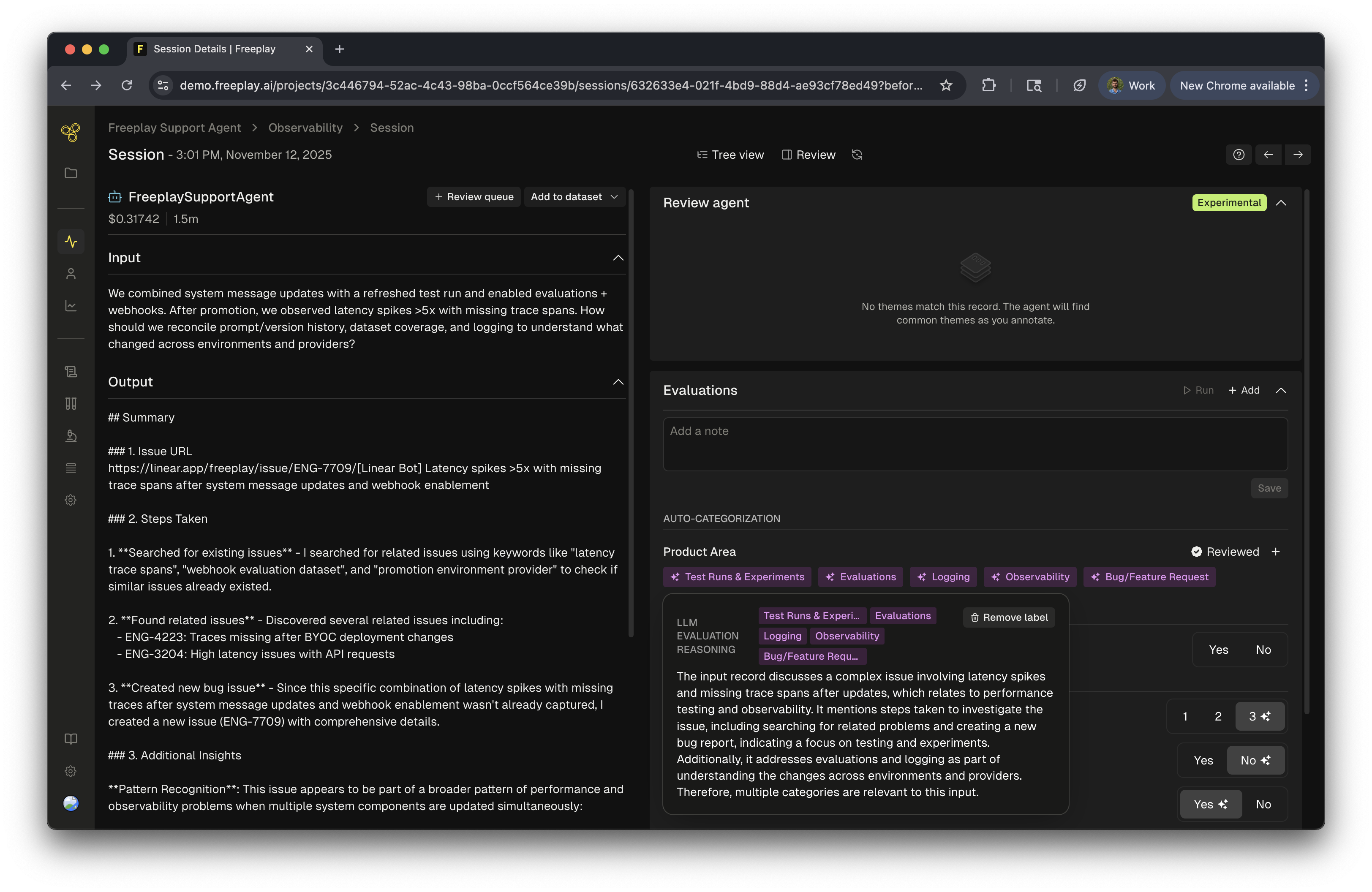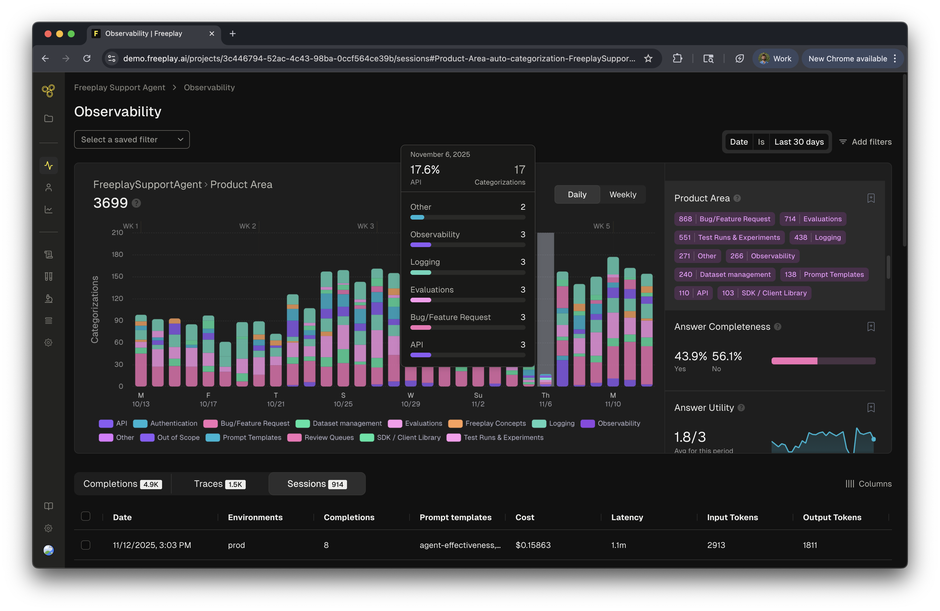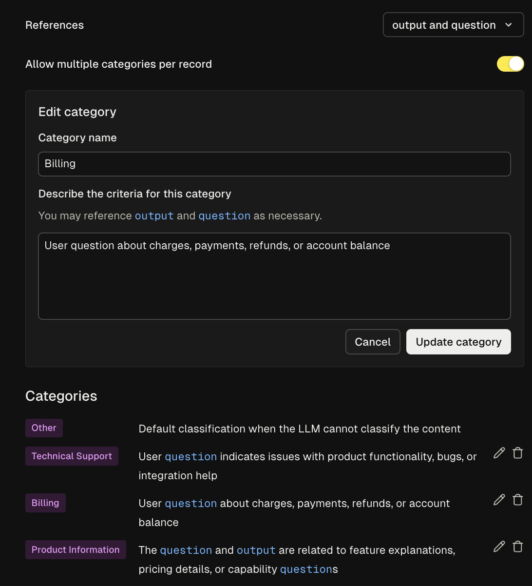 Auto-categorization works at both the agent and completion level. Start by defining category types that align with your business needs—such as product areas (API/SDK, Observability, Prompt Management) or user intent types (Technical Support, Billing, Product Information).Creating Effective Categories