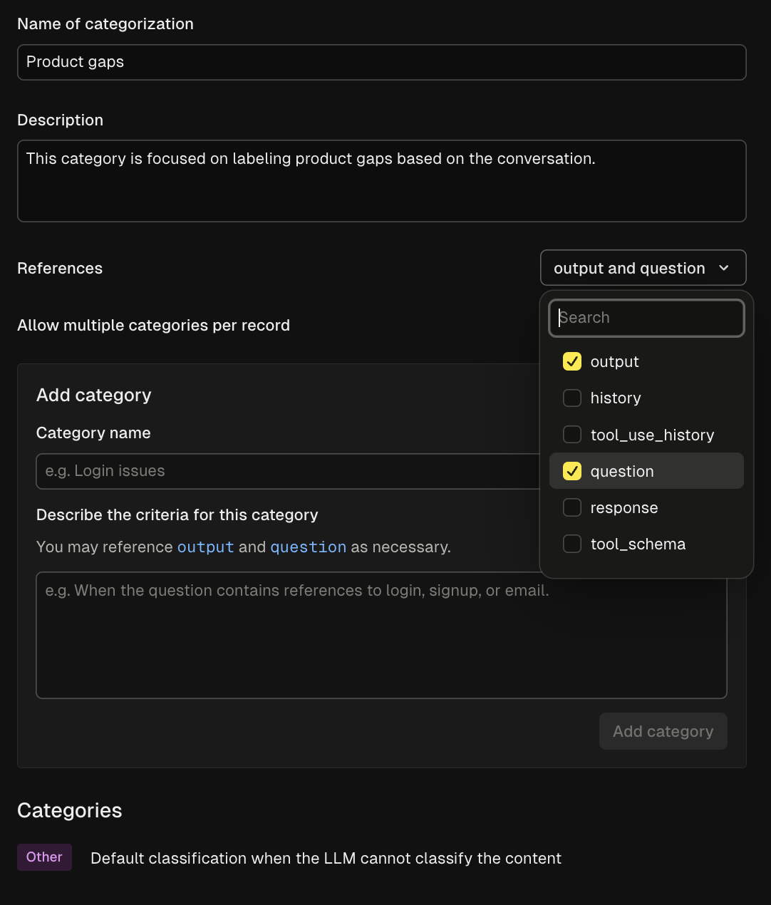 - Select relevant references - Choose which variables (input, output, history) the LLM should consider when categorizing