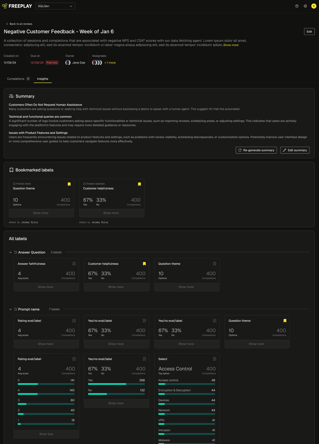 Streamline human review of your LLM systems with Freeplay’s Review Queues. Organize work assignments, generate actionable insights, and transform observations into meaningful improvements. Review Queues help you establish systematic, organized human review processes for your LLM systems in Freeplay. Easily select completions for your team to evaluate, assign specific work to team members, and generate comprehensive insight reports to share findings across your organization. Review Queues make it simple to maintain consistent review practices and transform observations into actionable improvements.Creating Review Queues