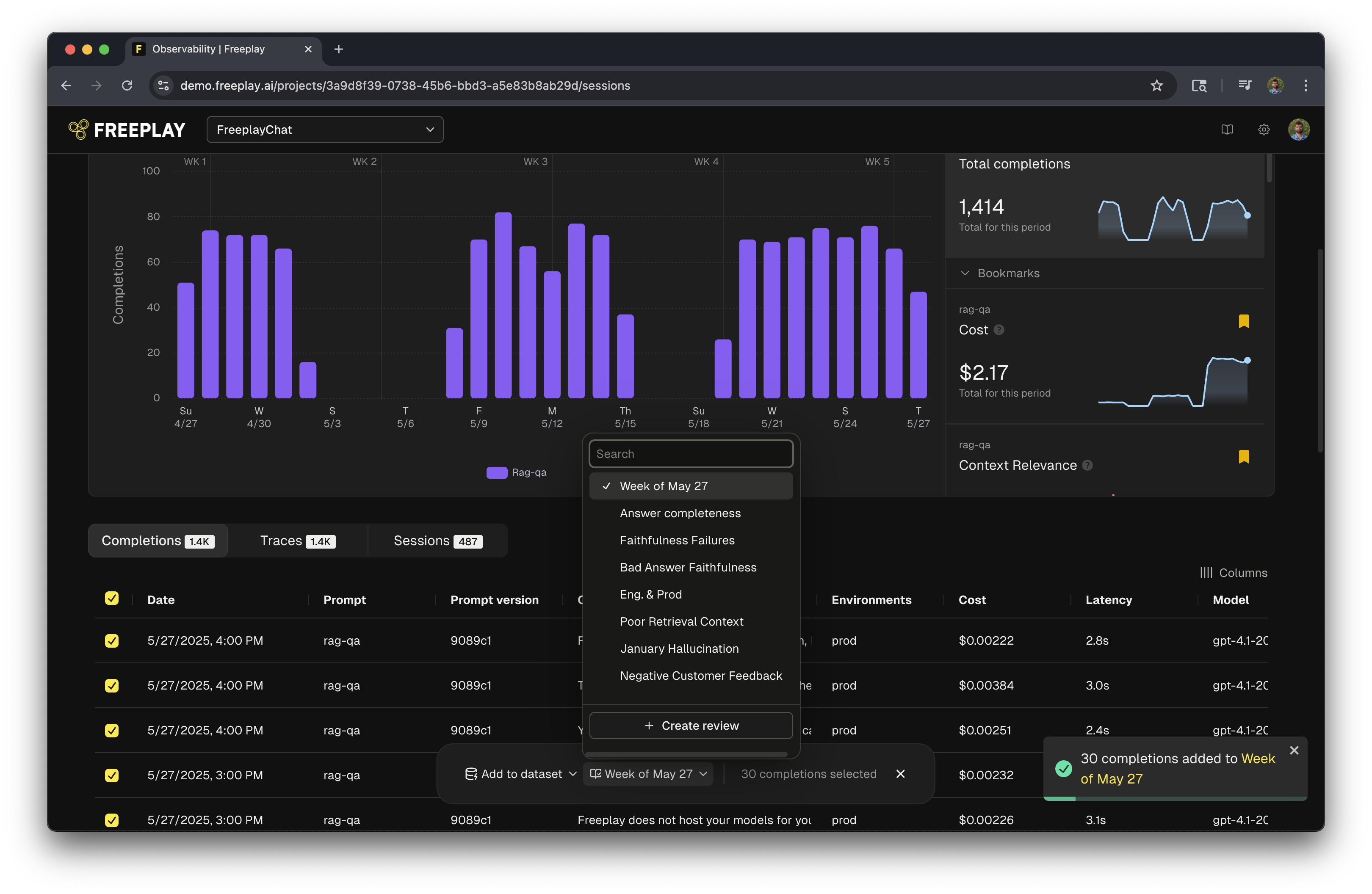 You can add Traces or Completions to a Review Queue for comprehensive analysis. Choose from two convenient methods: Bulk AddIndividual Add Perfect for adding multiple items at once:- Filter across specific criteria such as metadata, evaluation scores, or input fields