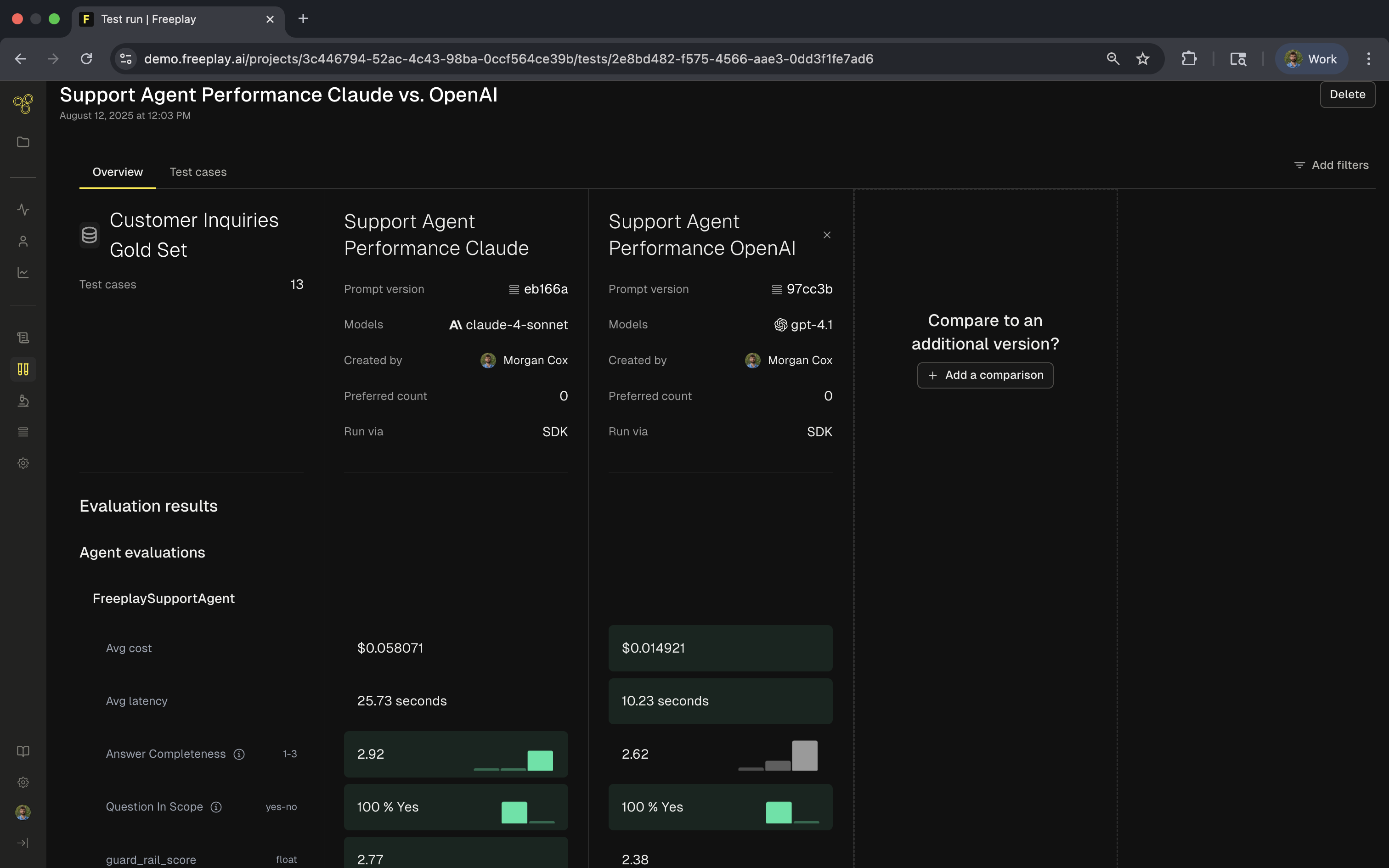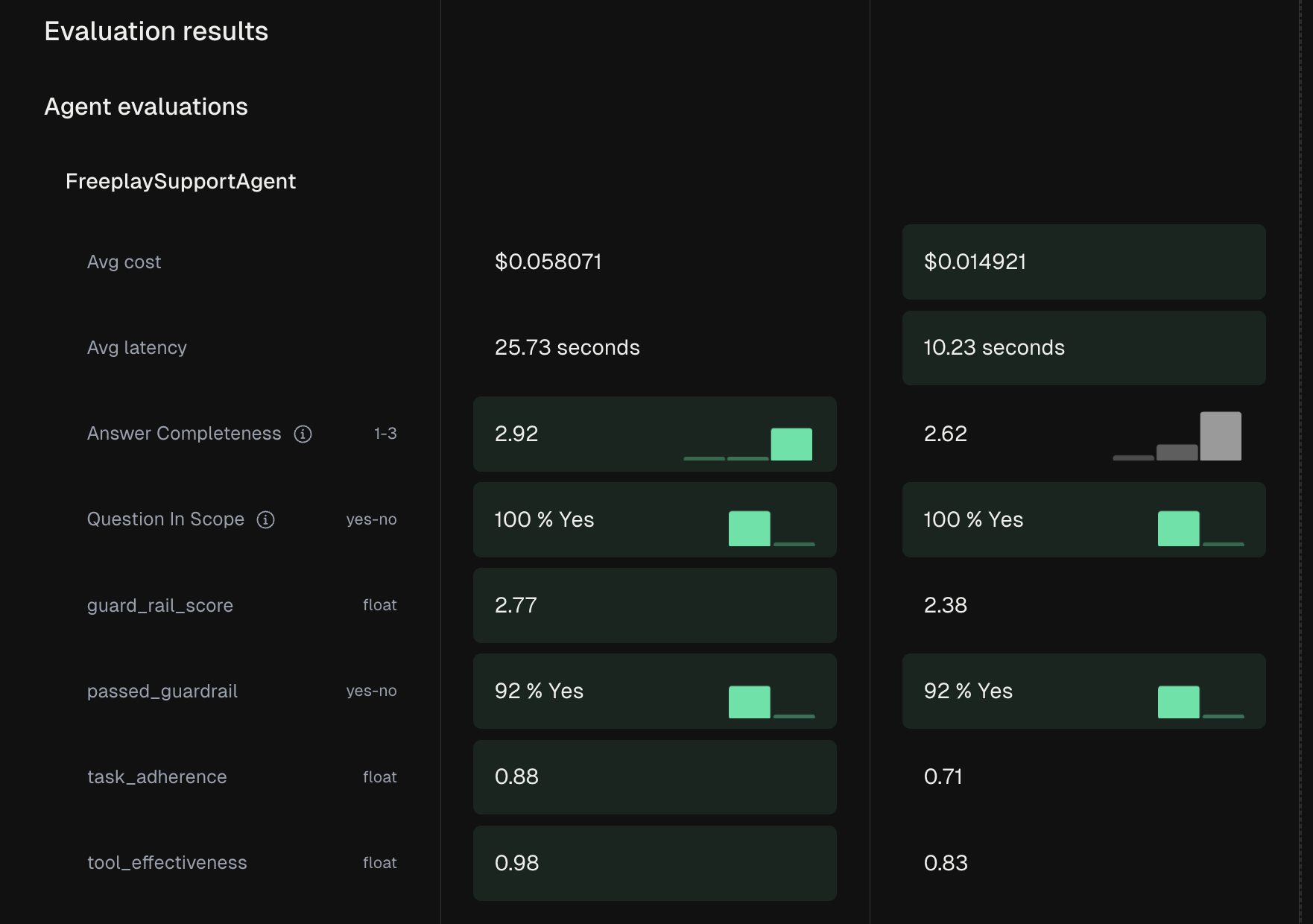 After running your tests, Freeplay provides comprehensive analysis at both the agent and component levels. The overview shows high-level metrics comparing different versions or models: