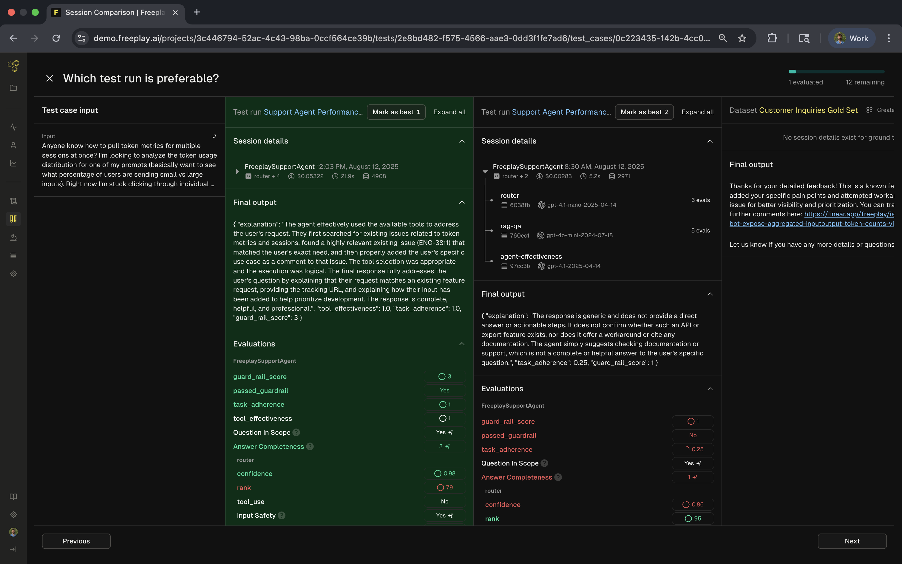 End-to-end tests execute through the SDK, giving you complete control over your system’s execution. Here’s how to test a support agent system that uses multiple sub-agents and tools. This example is using Freeplay’s Support Agent that helps us take in customer requests and make sure we are tracking them well. It is made up of several components includingFreeplaySupportAgent, DocsAgent and a LinearAgent. Each of these agents handles different tasks and follow the common router prompt format for testing. We are using an Agent (trace dataset) in Freeplay to test the end to end behavior.