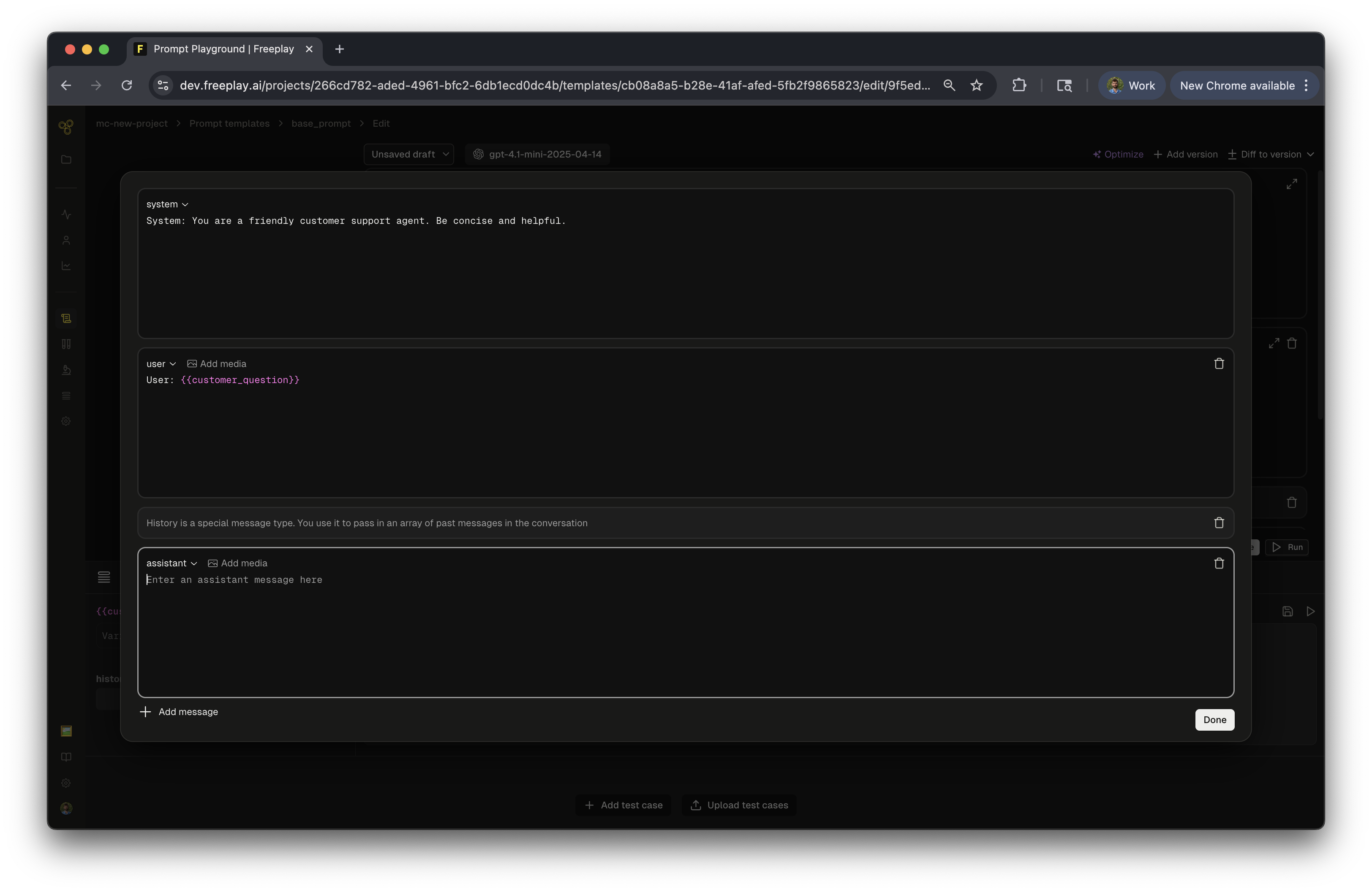 A special message type within Freeplay that represents conversation history. This makes it much easier to review and understand the context flowing through your LLM system, especially in multi-turn conversations.