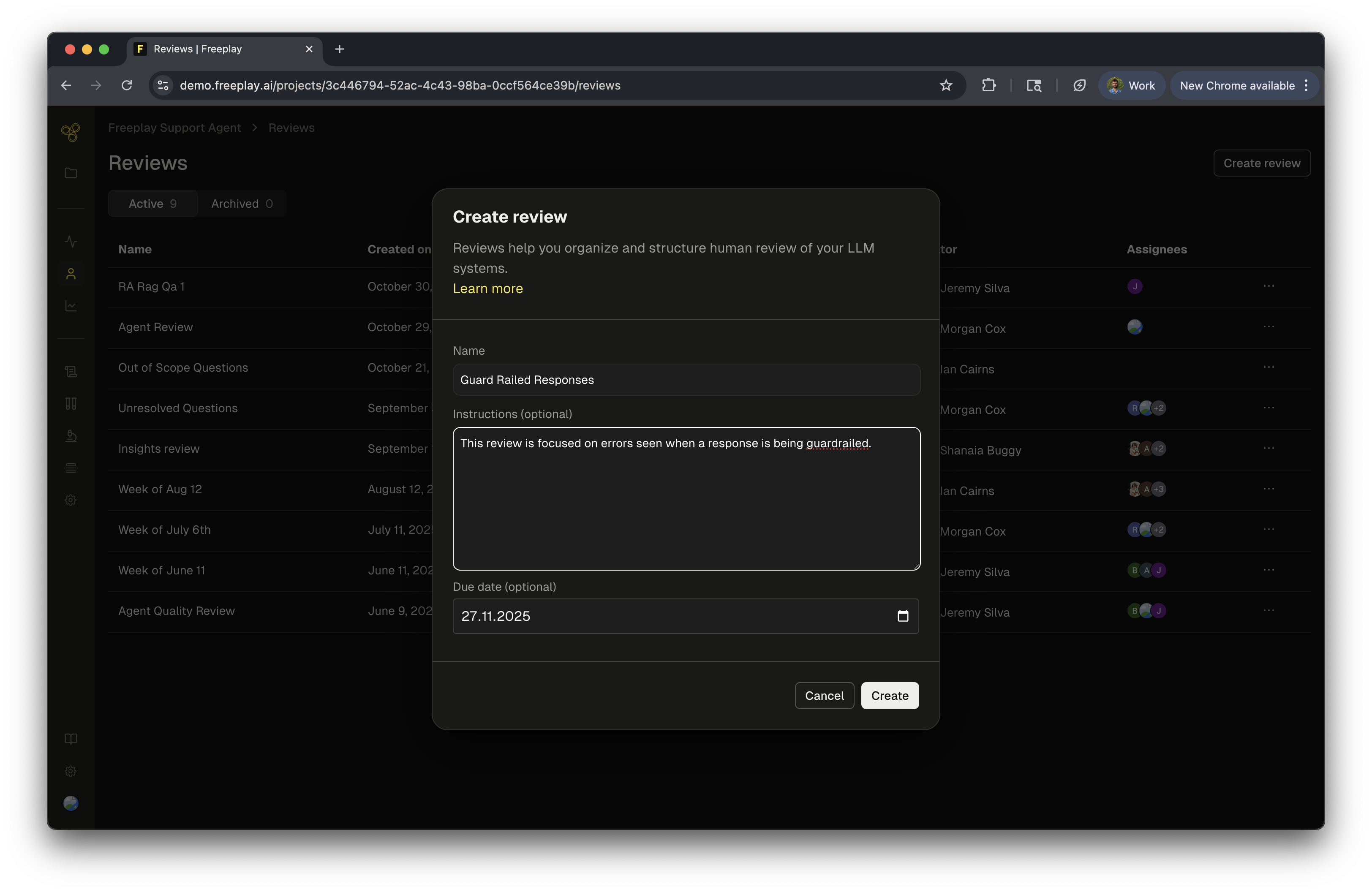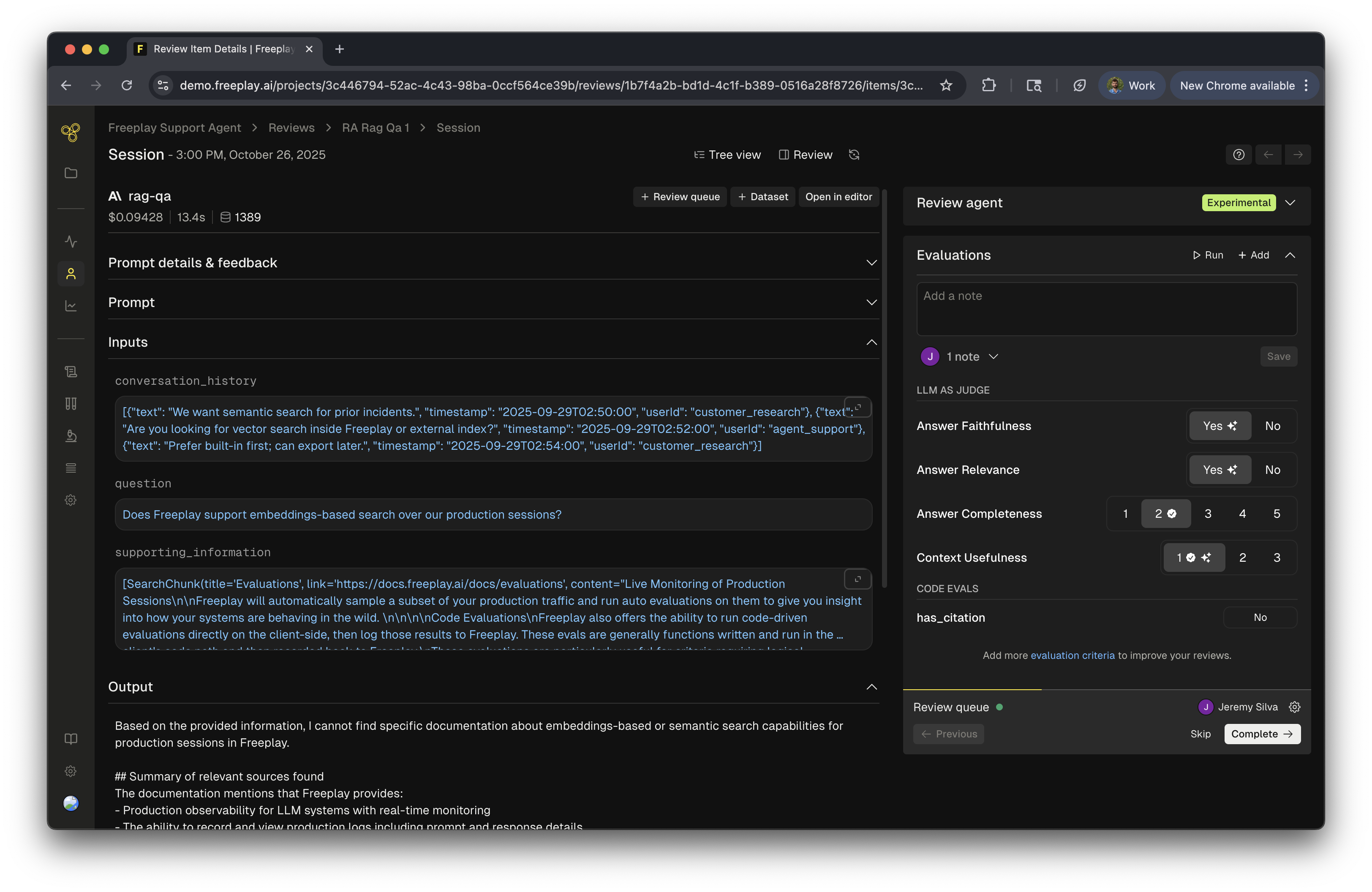 Review Queues help you establish systematic, organized human review processes for your LLM systems in Freeplay. Easily select completions for your team to evaluate, assign specific work to team members, and generate comprehensive insight reports to share findings across your organization. Review Queues make it simple to maintain consistent review practices and transform observations into actionable improvements.
