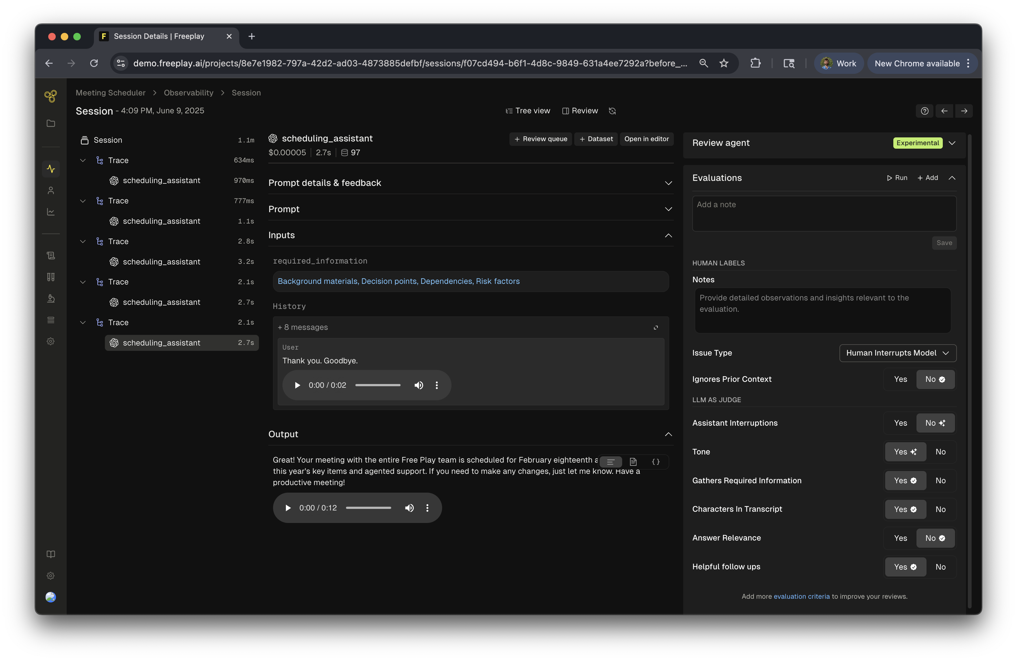 Once implemented, you’ll be able to view complete user interactions in Freeplay, including:- Audio recordings from the user and bot turns