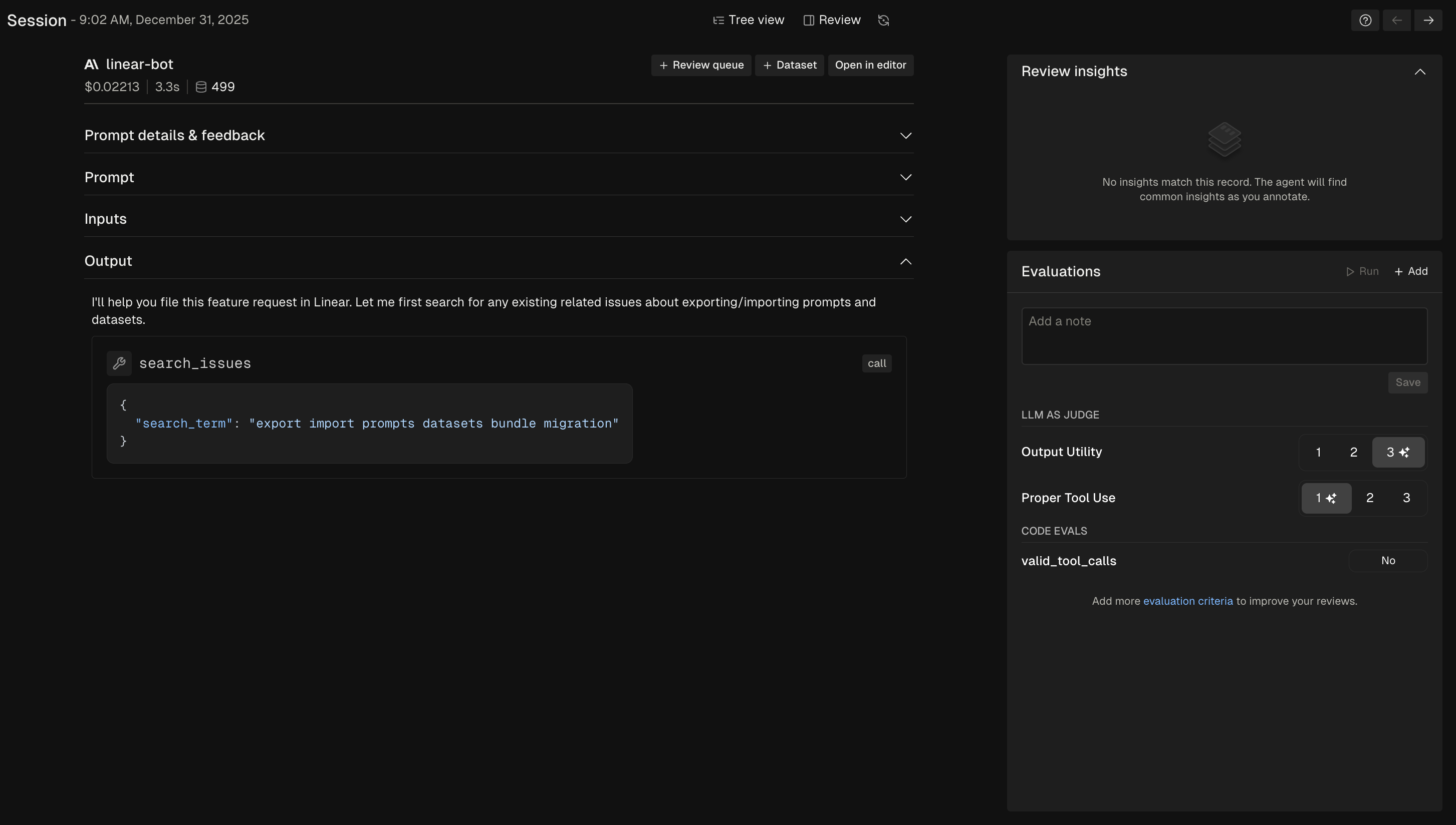 When building agents that use tools, tool calls are always recorded as the output of an LLM call. This works by default as long as you properly record the output messages of the LLM call. You can also add explicit tool spans to provide more data about tool execution, including latency and other metadata. These are recorded as a Trace withkind='tool' and linked to the parent completion.